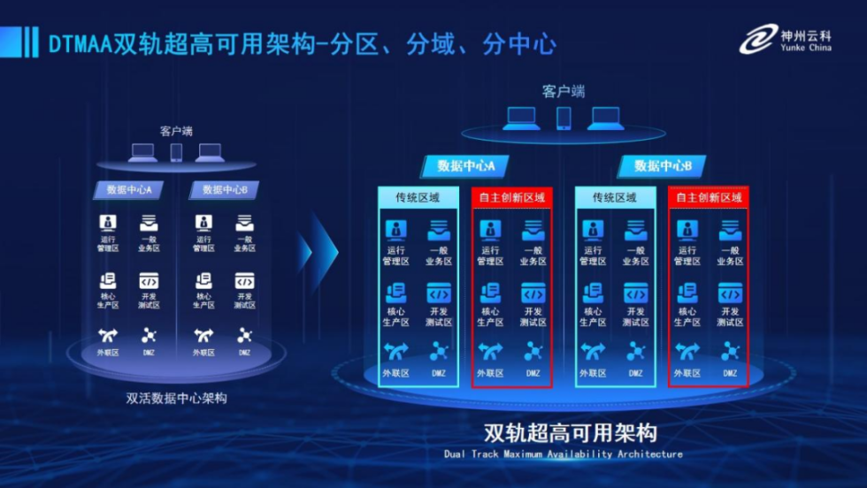 为帮助金融客户更好地应对数字经济时代对可持续性的高要求,实现“信创”与“数字化”齐头并进,LEYU乐鱼推出了双轨超高可用架构。该架构在双活数据中心的分区调度基础上,增加信创域和非信创域的分域调度,实行信创域与传统域应用全量部署,使双中心运营变为双中心四区域并行运行,互为多活,将“0到1”的单轨建设道路变为分区分域协同的多活双轨超高可用架构。帮助客户在新架构下,保障“信创”的同时解决性能瓶颈,提升稳定性,保证应用可持续性,最终实现信创区域和非信创区域的平滑过渡,完成国产化替代目标。